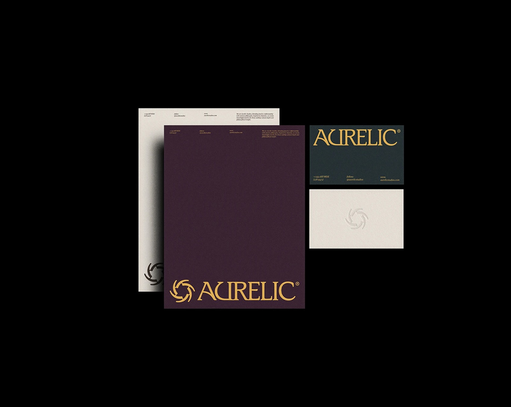 The final outcome is a cohesive brand system that looks consistent across print and product applications. The bold wordmark and gold detailing create strong recall, while the dark premium palette helps the brand stand out and feel upscale. Overall, the identity is simple, modern, and versatile, giving Aurelic a strong foundation that can scale easily across future marketing and packaging needs.