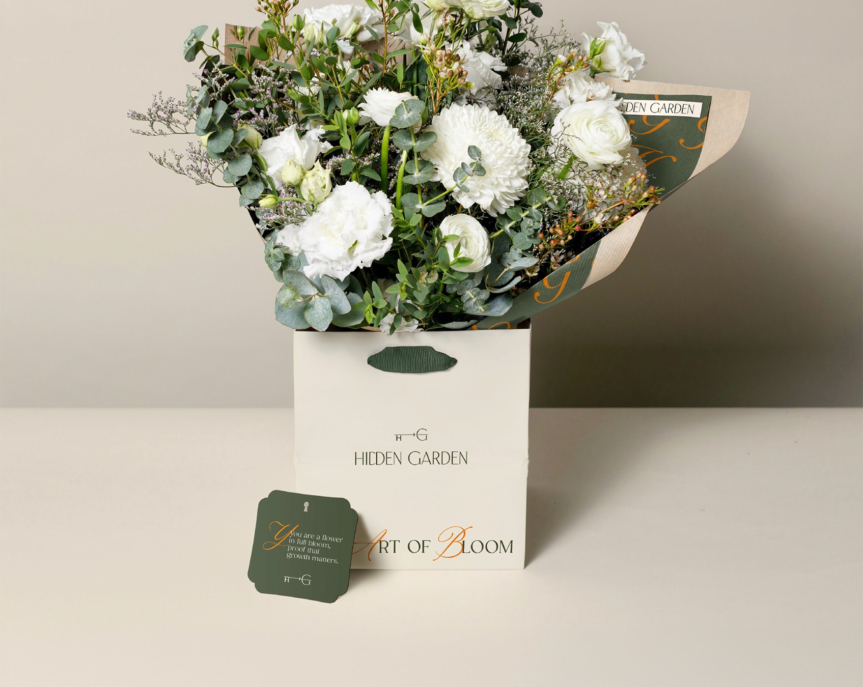 The objective was to build a distinctive, ownable identity for Hidden Garden that instantly feels elegant, calm, and premium like a thoughtfully curated bouquet. The vision focused on clarity and memorability: a refined HG monogram, confident typography, and clean spacing that feels modern yet warm. Every choice color, type, and layout was guided by readability, an “Art of Bloom” story, and easy use across real‑world touchpoints.